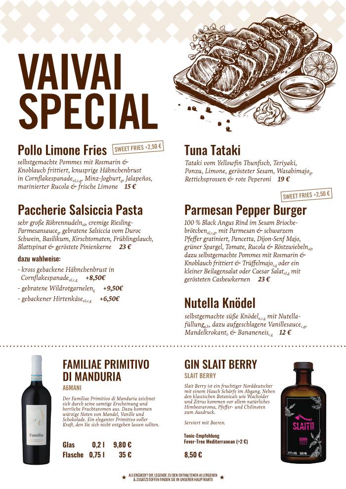 Die Zubereitung aller Produkte erfolgt in unserem Haus unter größter Sorgfalt. Produkte, die Allergene oder Zusatzstoffe enthalten, sind durch die entsprechenden Buchstaben und Zahlen gekennzeichnet: