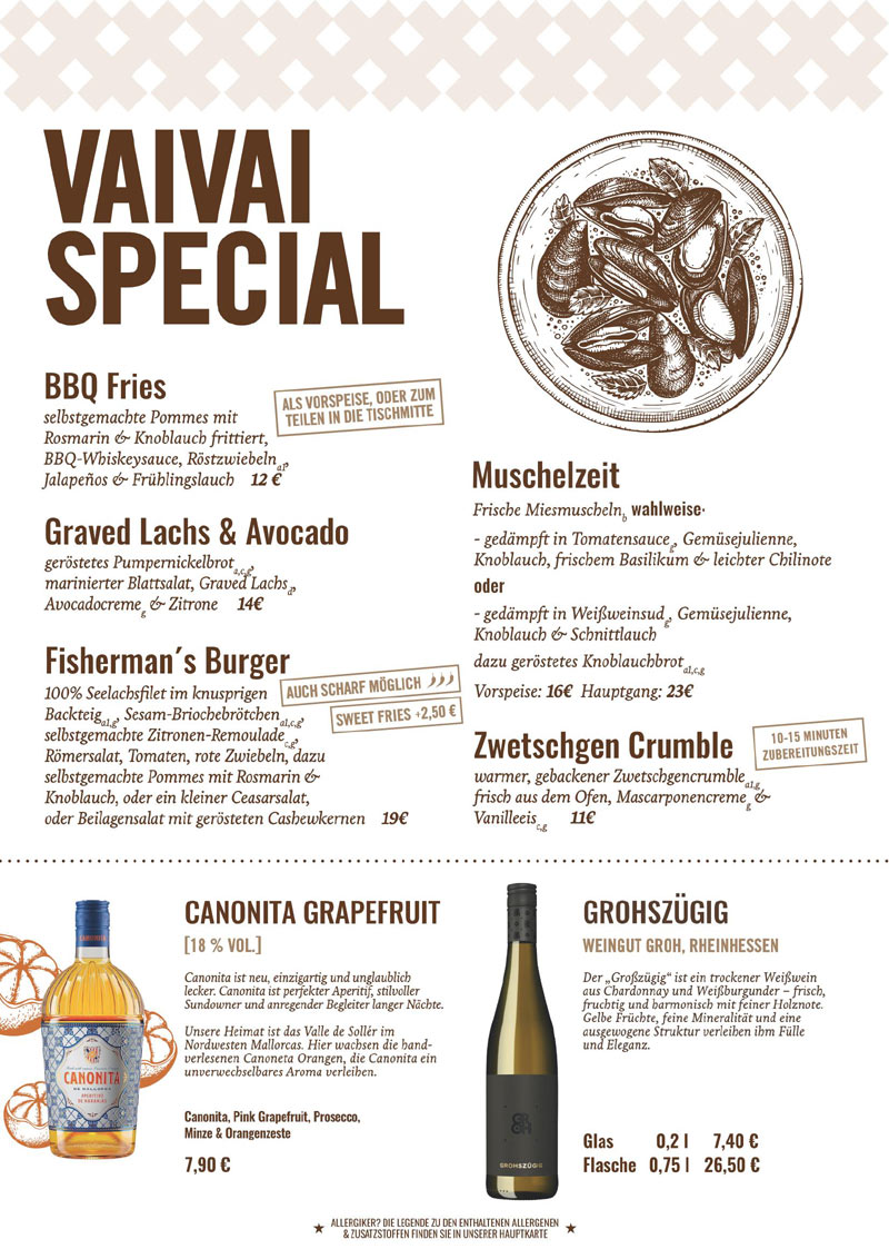 Die Zubereitung aller Produkte erfolgt in unserem Haus unter größter Sorgfalt. Produkte, die Allergene oder Zusatzstoffe enthalten, sind durch die entsprechenden Buchstaben und Zahlen gekennzeichnet: